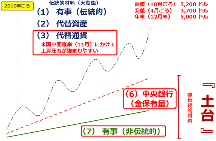 戦争やテロがもたらす不安感を意味する「(1)有事(伝統的)」、株との逆相関を意味する「(2)代替資産」、ドルとの逆相関を意味する「(3)代替通貨」が、短中期視点のテーマです。2026年のイベントに挙げた、ウクライナ戦争や中東情勢の動向は(1)、米国の中間選挙や世界的なスポーツの大会は(2)、米国の利下げ動向は(3)に分類できます。