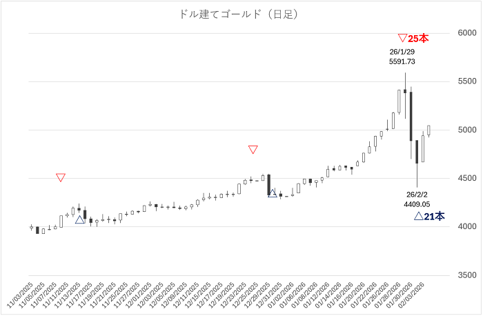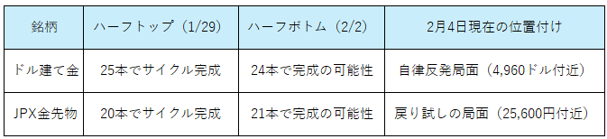 2月2日の安値(ドル建て4,409ドル/国内22,601円)でサイクルがボトムを打ったと仮定すると、現在は新たな上昇波動の初期段階、あるいは急落に対する修正リバウンドの過程にあります。特に国内価格は、円安基調が下支えとなっており、ドル建てよりも戻りが早い傾向が見られます。