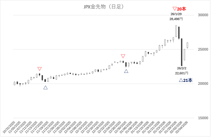 JPX金先物: 25,500円〜25,600円付近(現在地)。ここを維持できるかが焦点です。