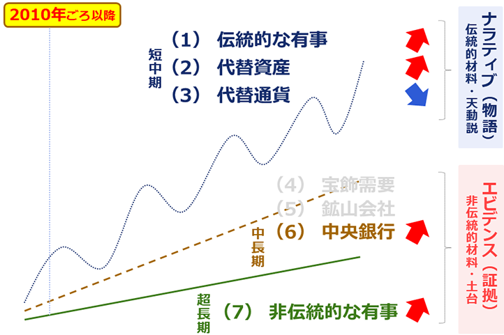 では2010年ごろ以降の、つまり現代の金(ゴールド)相場を分析する際に、どのようにエビデンス(証拠)とナラティブ(物語)を用いればよいのでしょうか。
